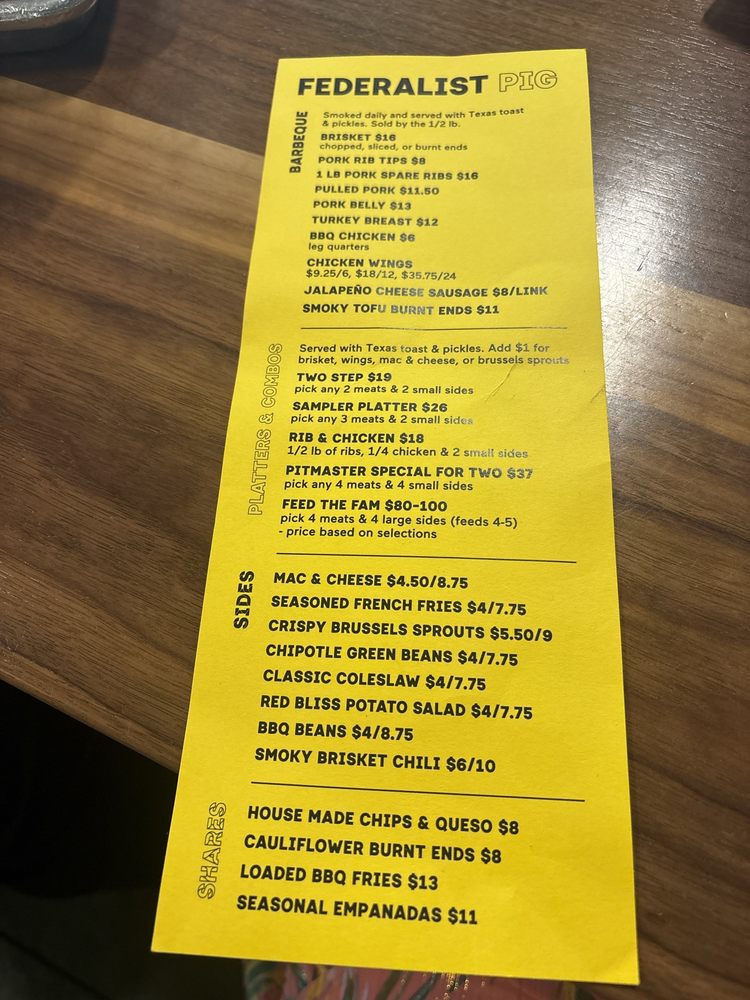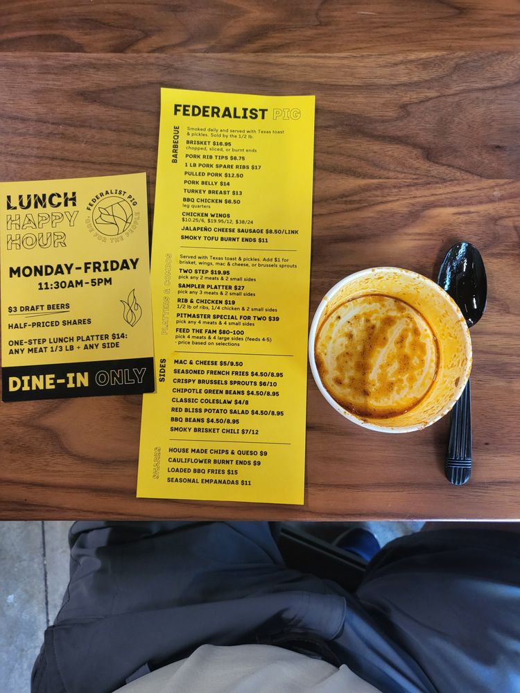 Overall, Federalist Pig is a must-visit for BBQ enthusiasts seeking a diverse menu with standout options. Don't miss out on their seasonal specials and happy hour deals for a satisfying dining experience.